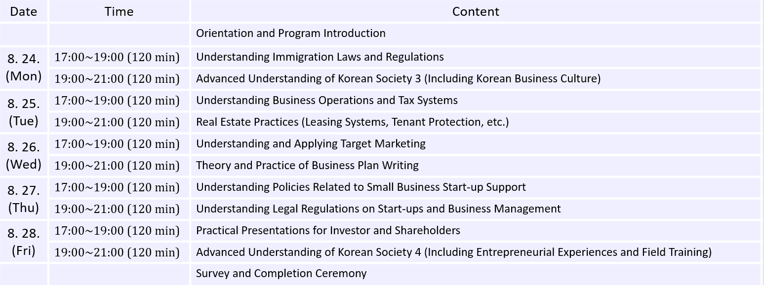 Program Objective: To provide advanced education necessary for filing intellectual property rights and acquiring essential knowledge for residing in Korea.