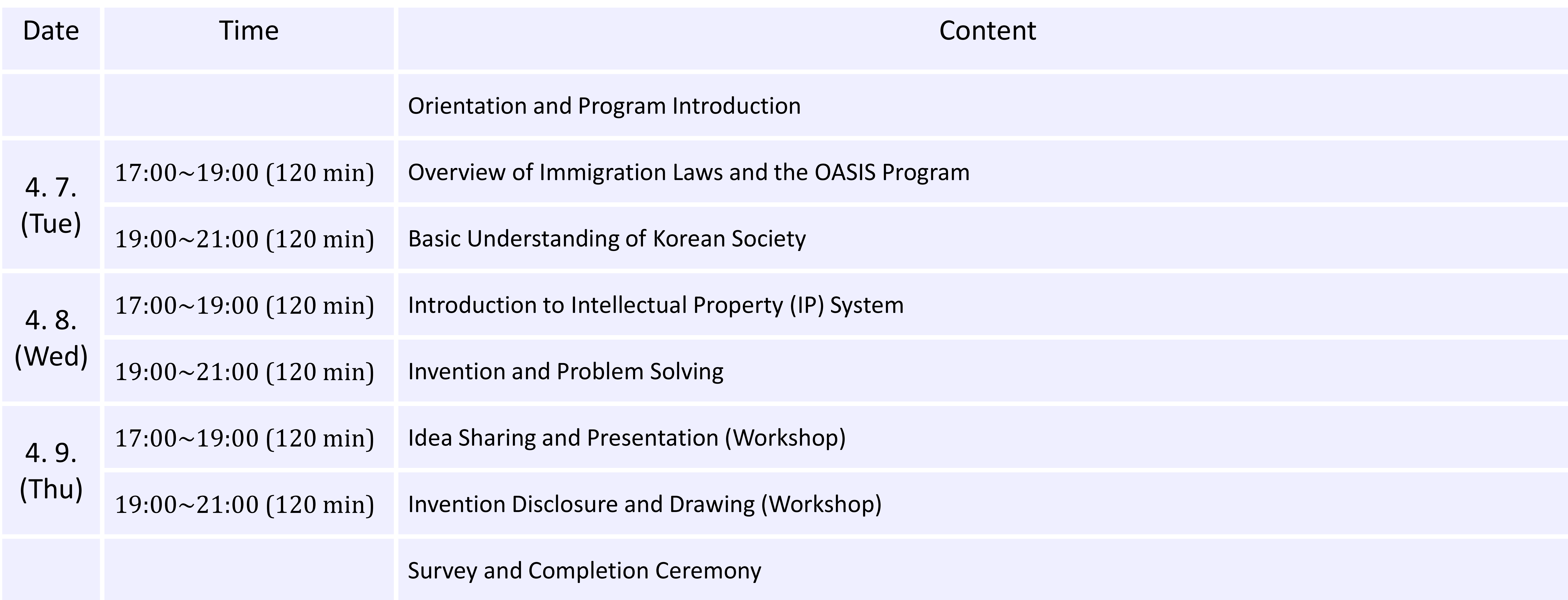 오리엔테이션부터 출입국관리 법령, 대한민국 사회 이해, 지식재산 제도, 발명과 문제해결, 아이디어 발표 및 실습까지 실무 중심 교육으로 구성되어 있습니다.