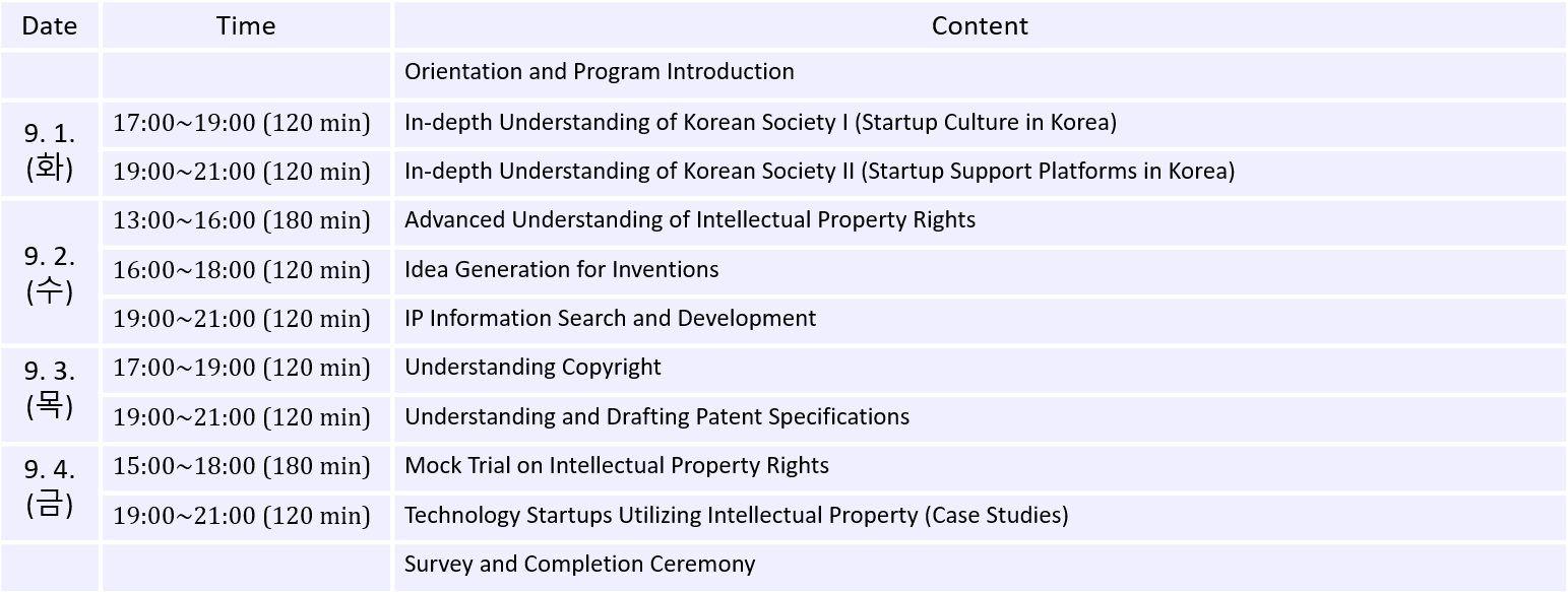 Program Objective: To provide advanced education required for filing intellectual property rights and for acquiring essential knowledge to reside in Korea.