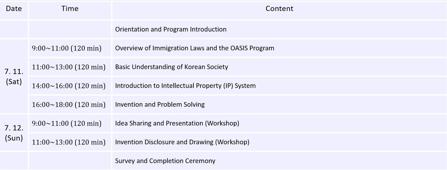 오리엔테이션부터 출입국관리 법령, 대한민국 사회 이해, 지식재산 제도, 발명과 문제해결, 아이디어 발표 및 실습까지 실무 중심 교육으로 구성되어 있습니다.