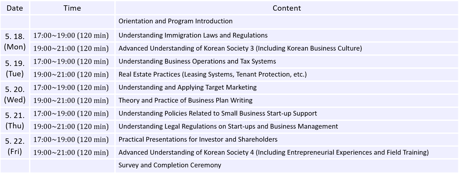 ※ Participants who fail to complete the course due to absence, withdrawal, or expulsion will be restricted from all programs for 6 months after the end date. Exceptions apply with proof of unavoidable reasons (e.g., illness or accident).