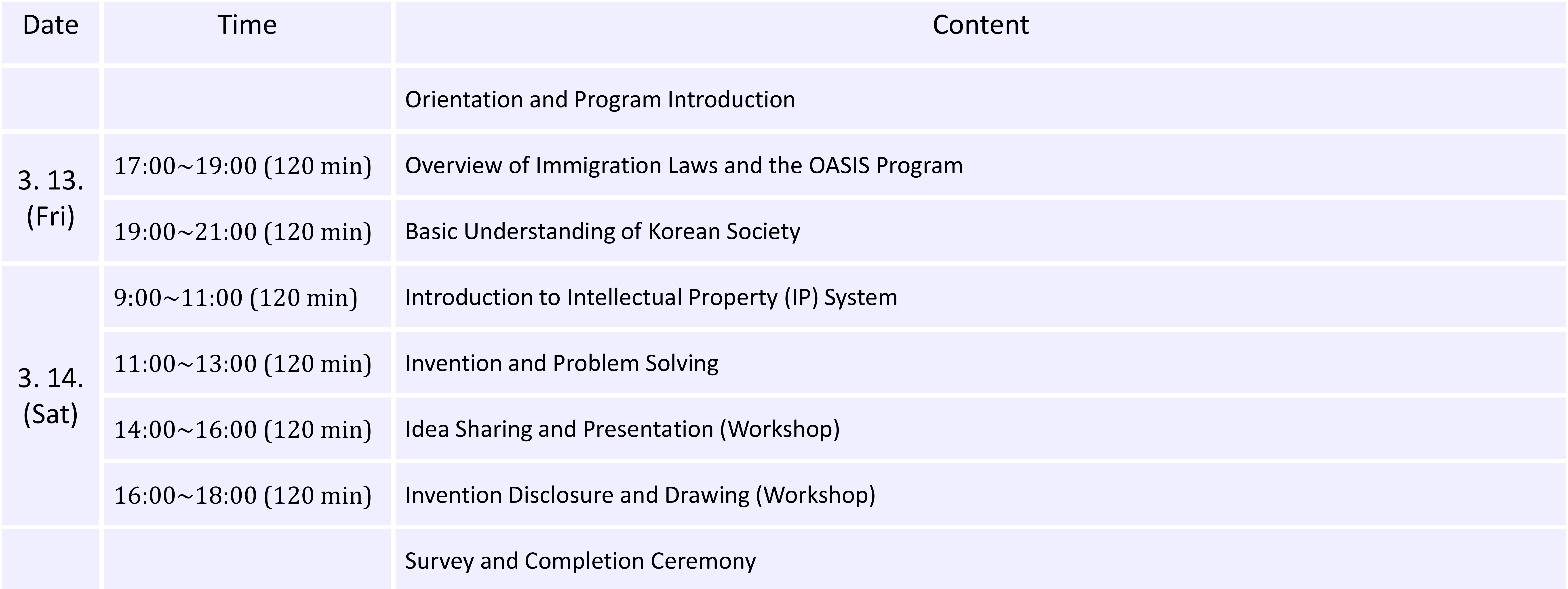 오리엔테이션부터 출입국관리 법령, 대한민국 사회 이해, 지식재산 제도, 발명과 문제해결, 아이디어 발표 및 실습까지 실무 중심 교육으로 구성되어 있습니다.