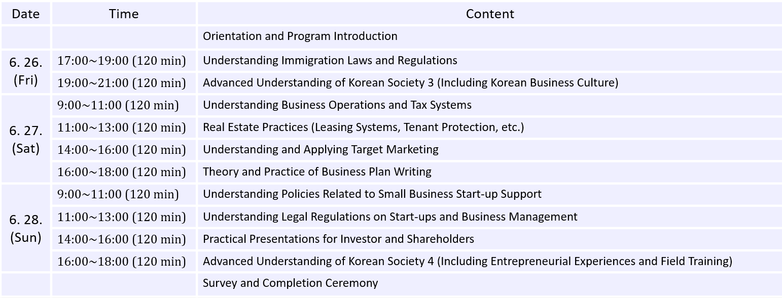 Program Objective: To provide advanced education necessary for filing intellectual property rights and acquiring essential knowledge for residing in Korea.