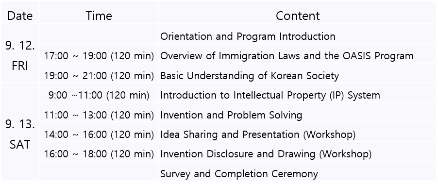 Program Objective: foundational courses on acquiring (filing) intellectual property rights and essential knowledge required for staying in Korea.